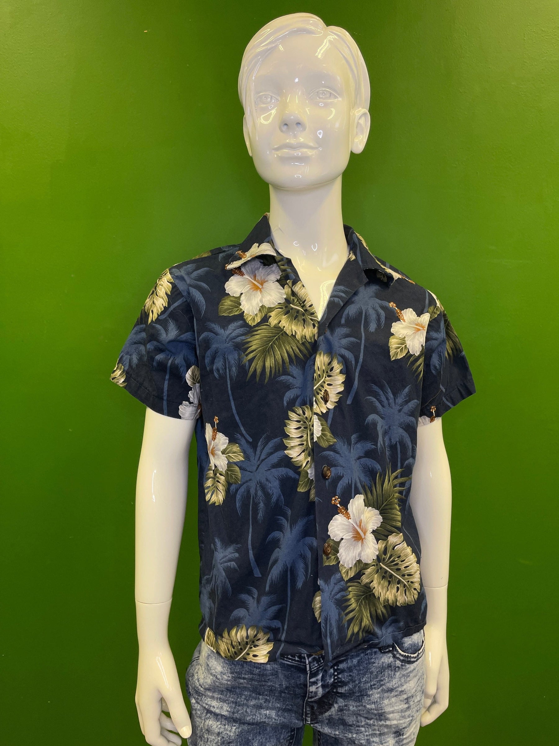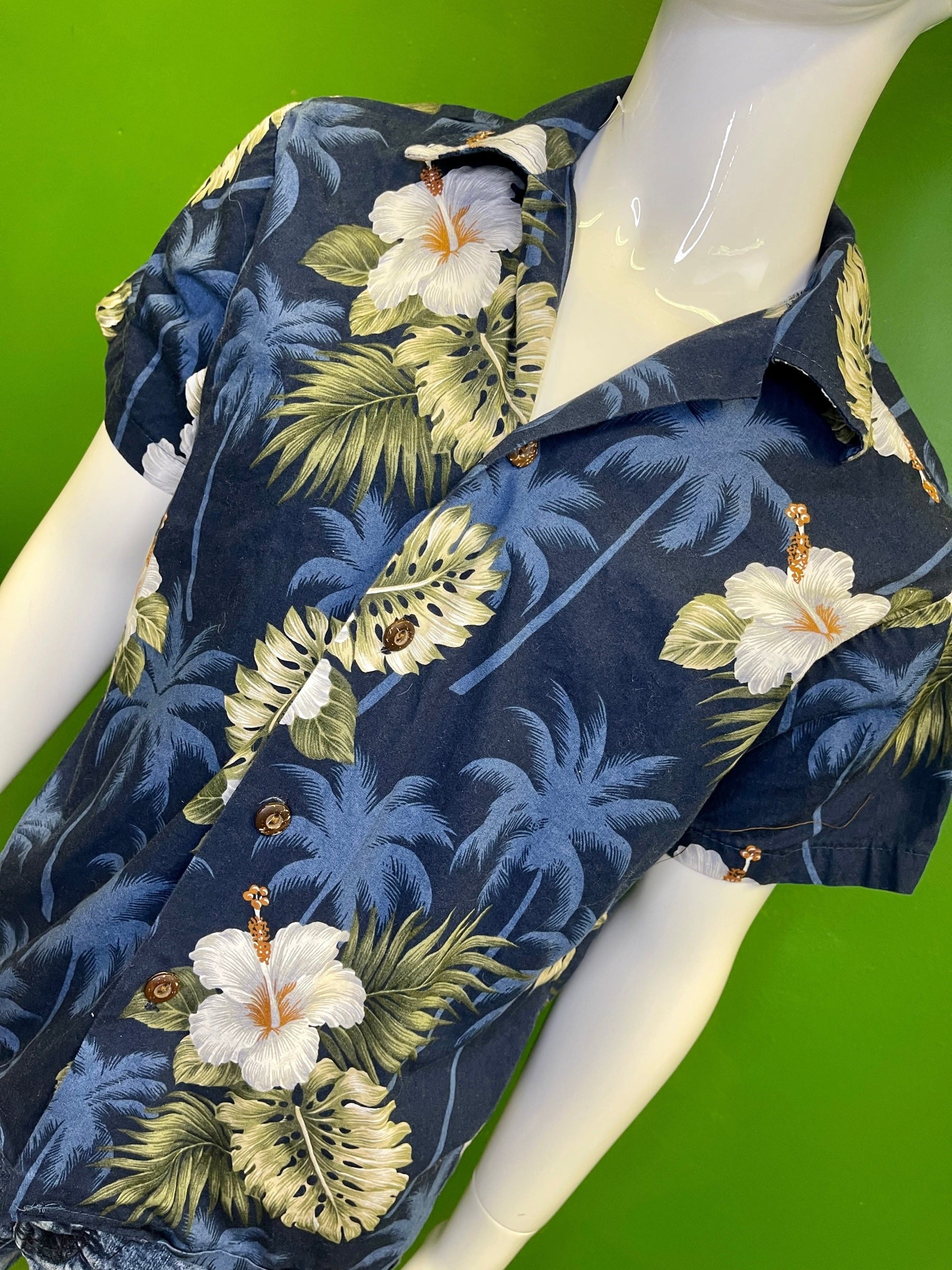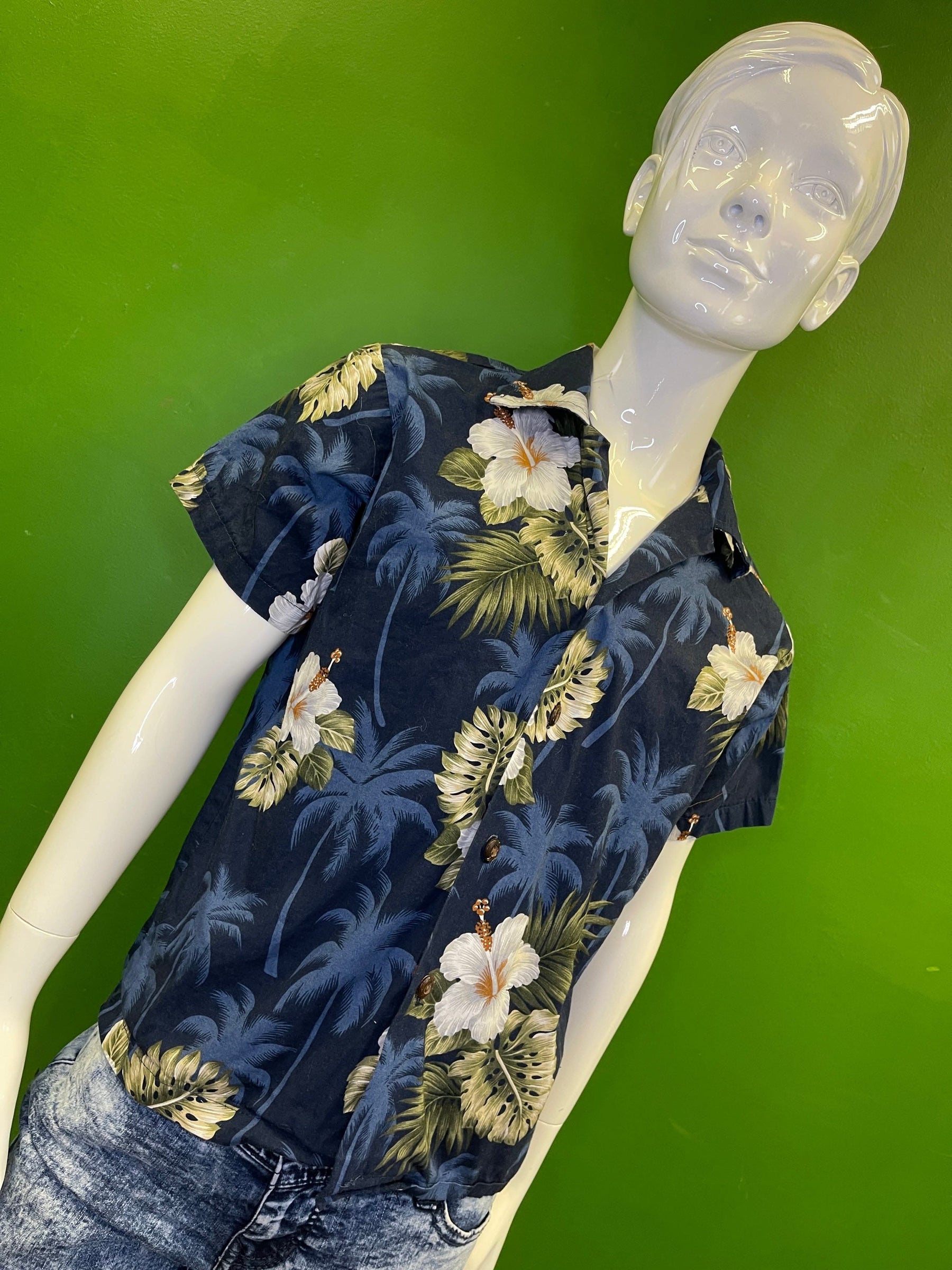 Made in Hawaii Blue/White/Green Floral Hawaiian Aloha Shirt Youth Small 6-8