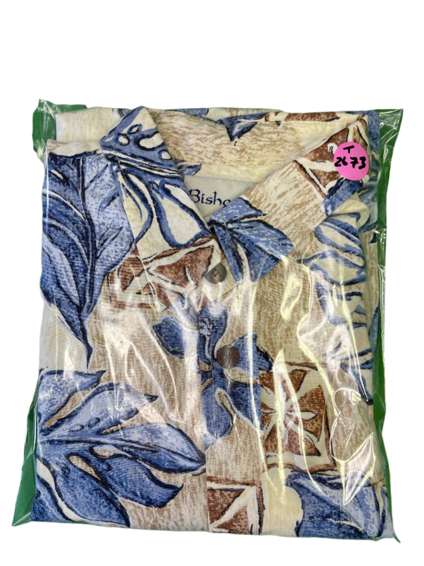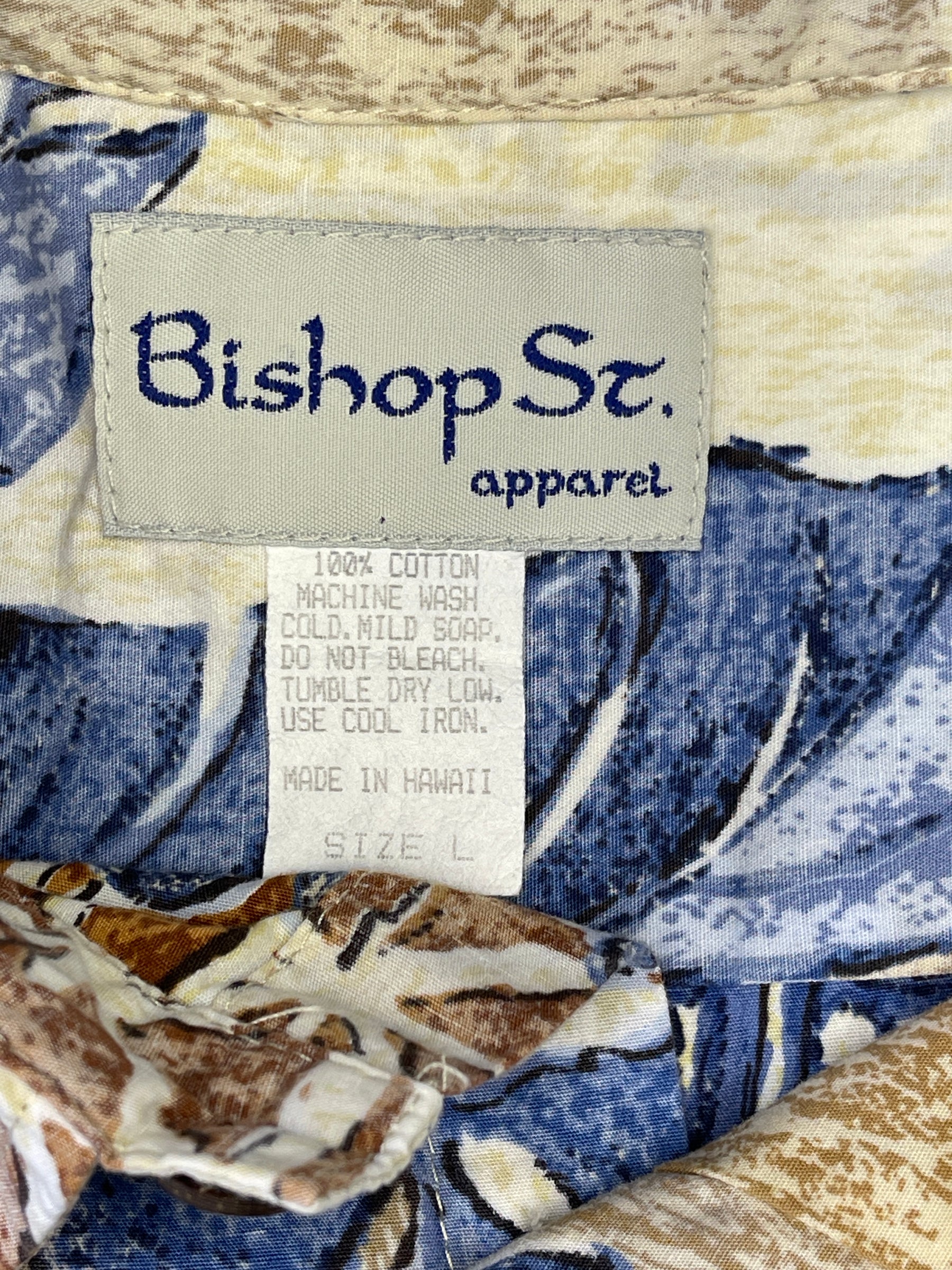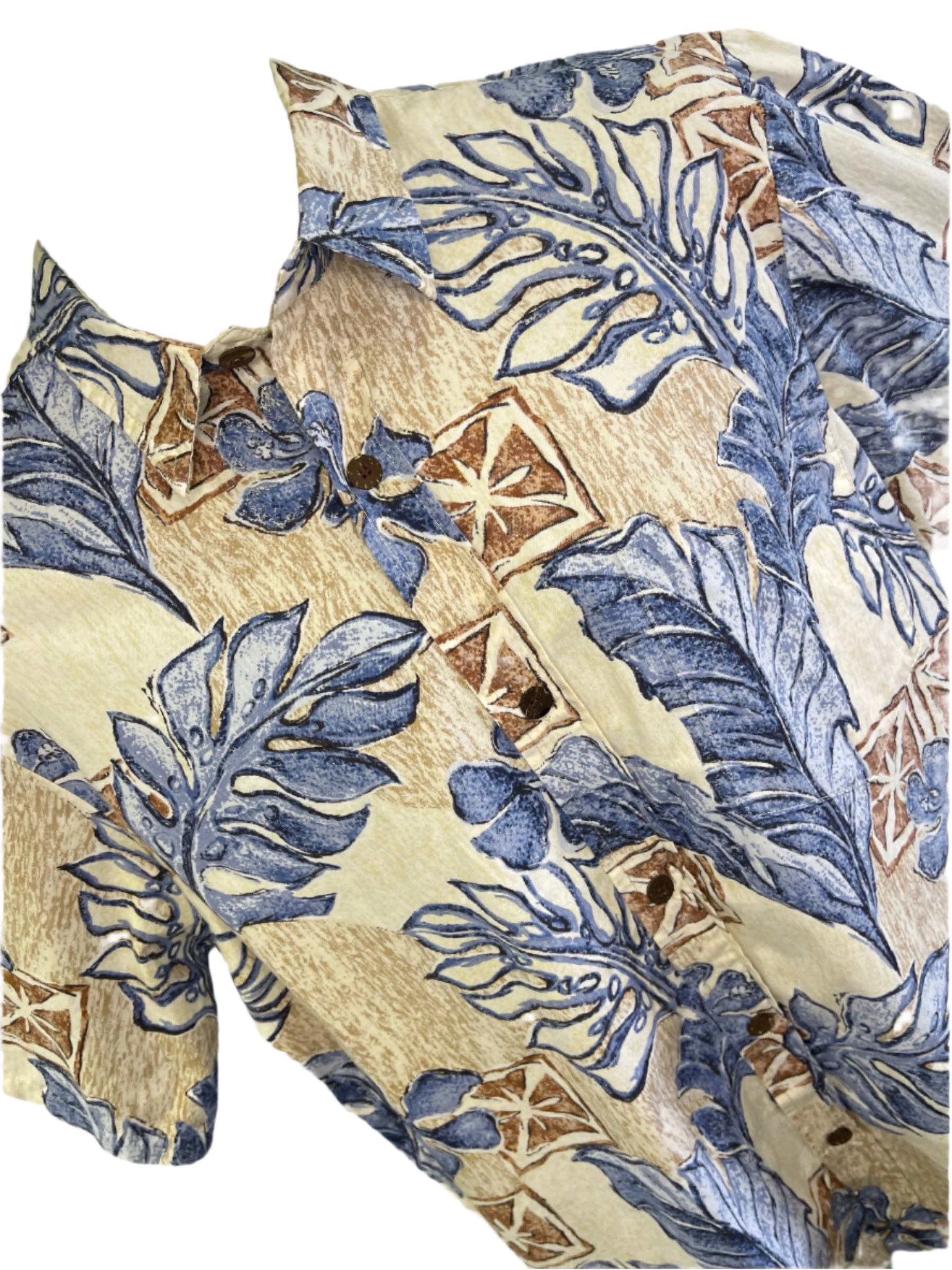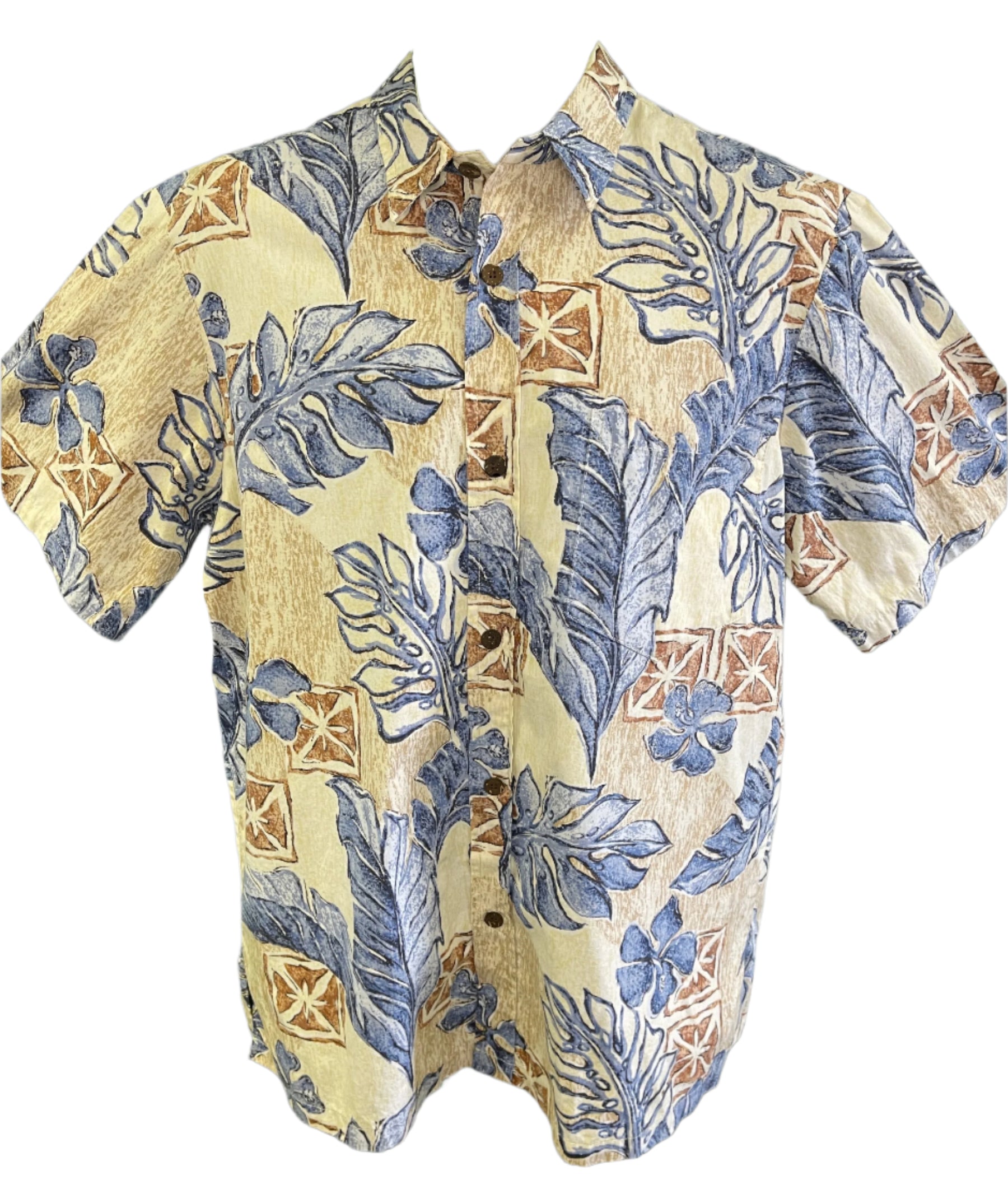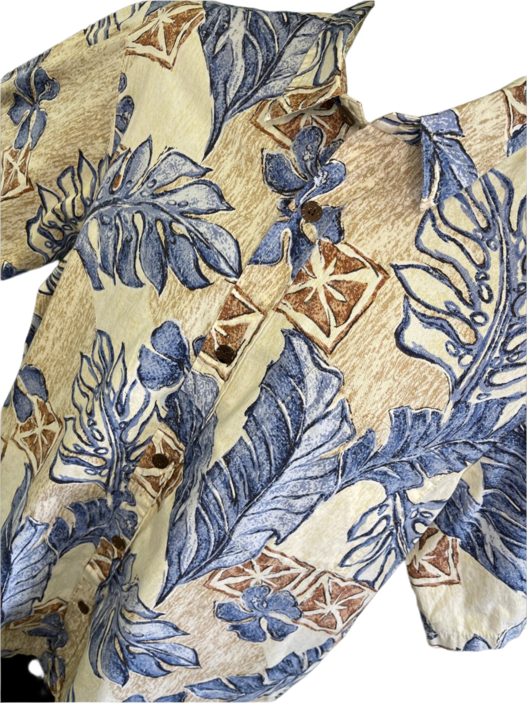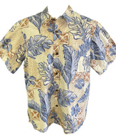 Hawaiian Aloha Shirt Made in Hawaii Dark Blue Tan Palm Leaves Men's Large