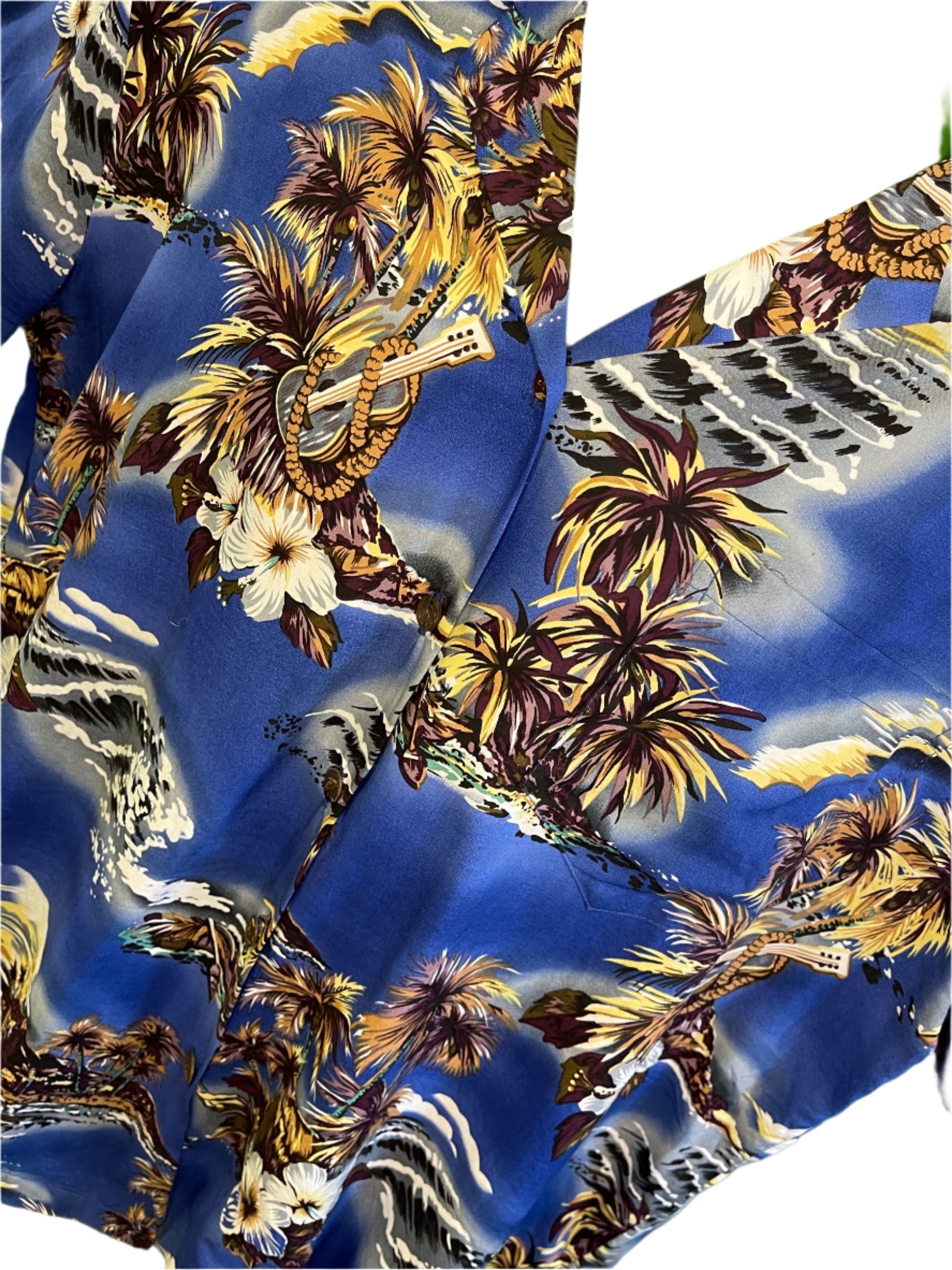 - Blue background with Hawaiian scenes, ukulele